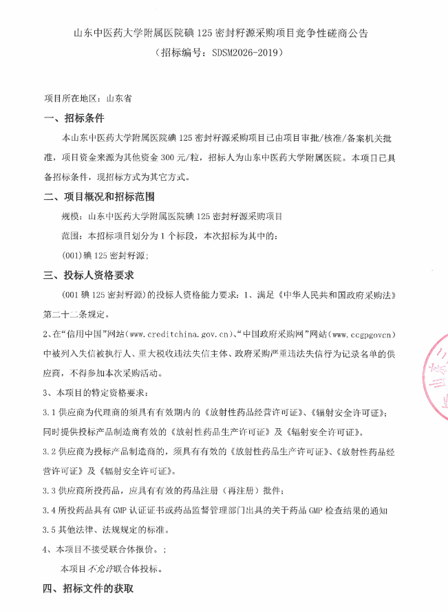 【山东中医药大学附属医院】山东中医药大学附属医院碘125密封籽源采购项目竞争性磋商公告