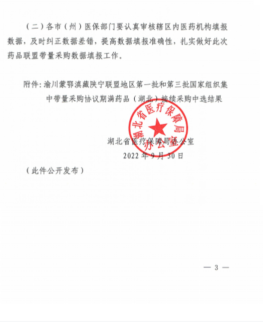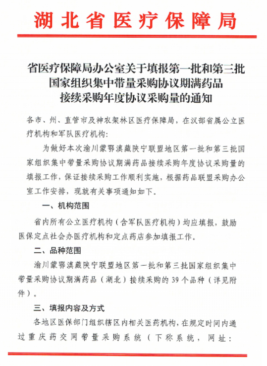 【湖北】湖北省医疗保障局办公室关于填报第一批和第三批国家组织集中带量采购协议期满药品接续采购年度协议采购量的通知