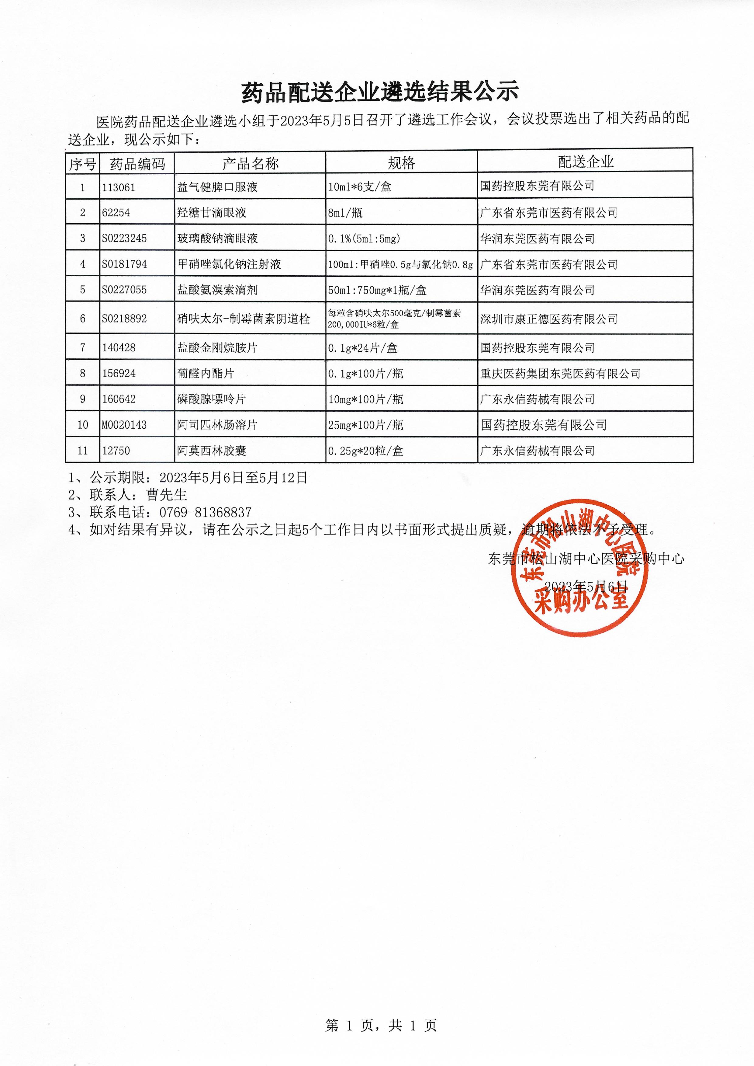 【东莞市松山湖中心医院】广东省东莞市松山湖中心医院药品配送企业遴选结果公示(2023.5.6)