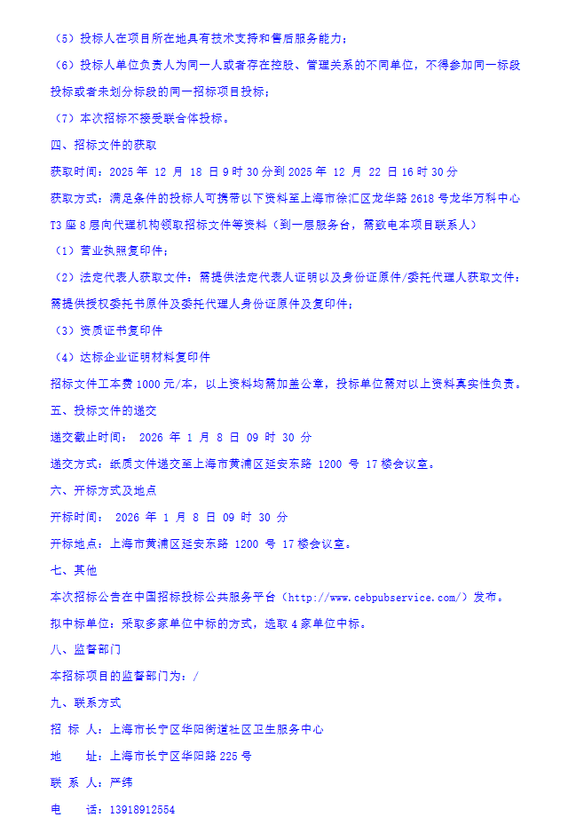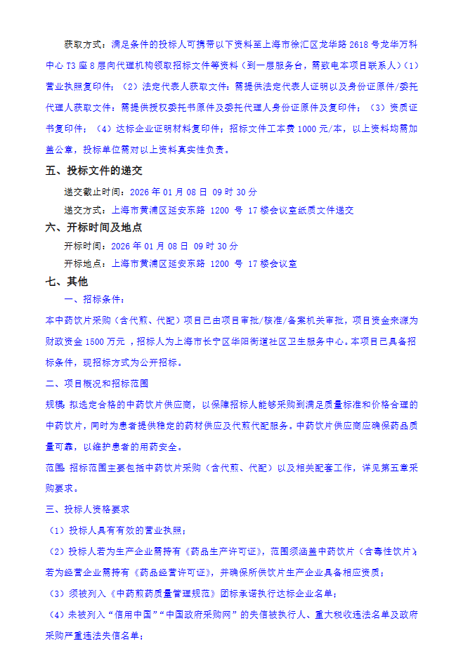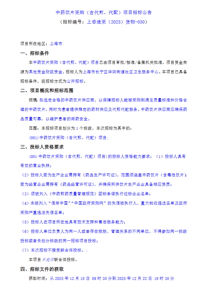 【上海市长宁区华阳街道社区卫生服务中心】上海市长宁区华阳街道社区卫生服务中心中药饮片采购(含代煎、代配)项目招标公告