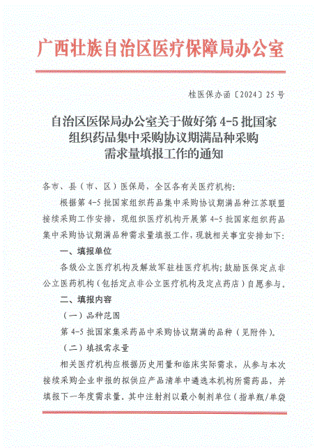 【广西】广西壮族自治区医保局办公室关于做好第4-5批国家组织药品集中采购协议期满品种采购需求量填报工作的通知