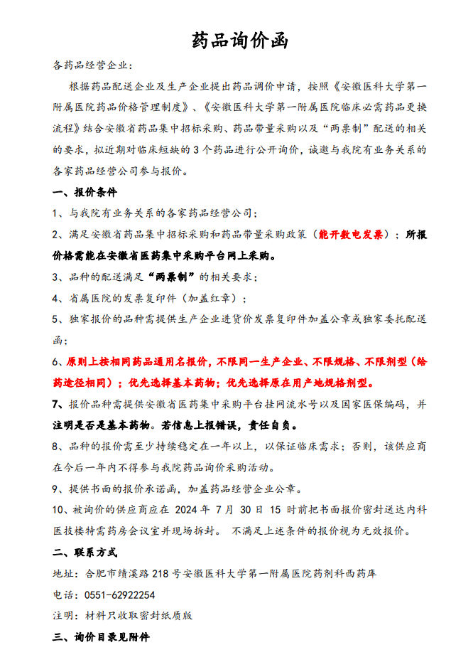 【安徽医科大学第一附属医院】安徽医科大学第一附属医院药品询价函(2024年第七次)