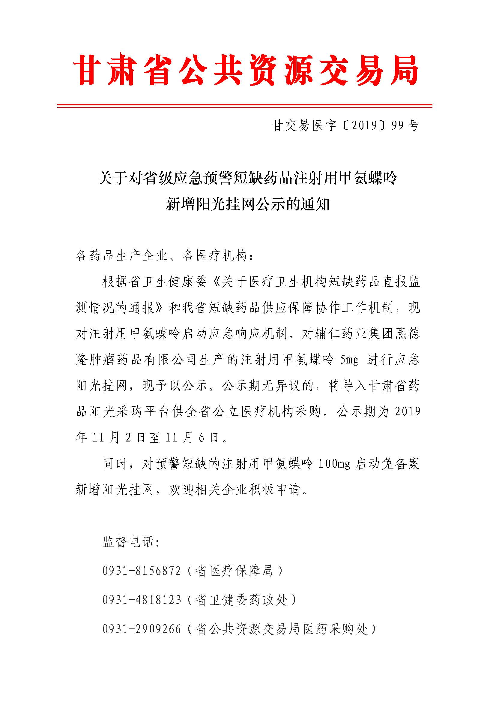 【甘肃】甘肃省关于对省级应急预警短缺药品注射用甲氨蝶呤新增阳光挂网公示的通知