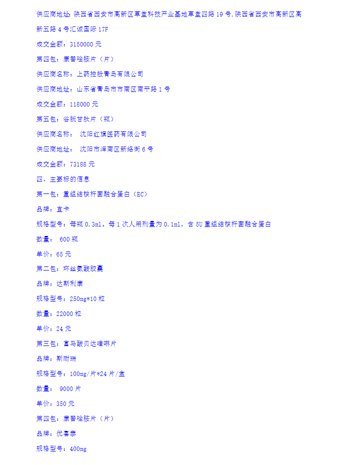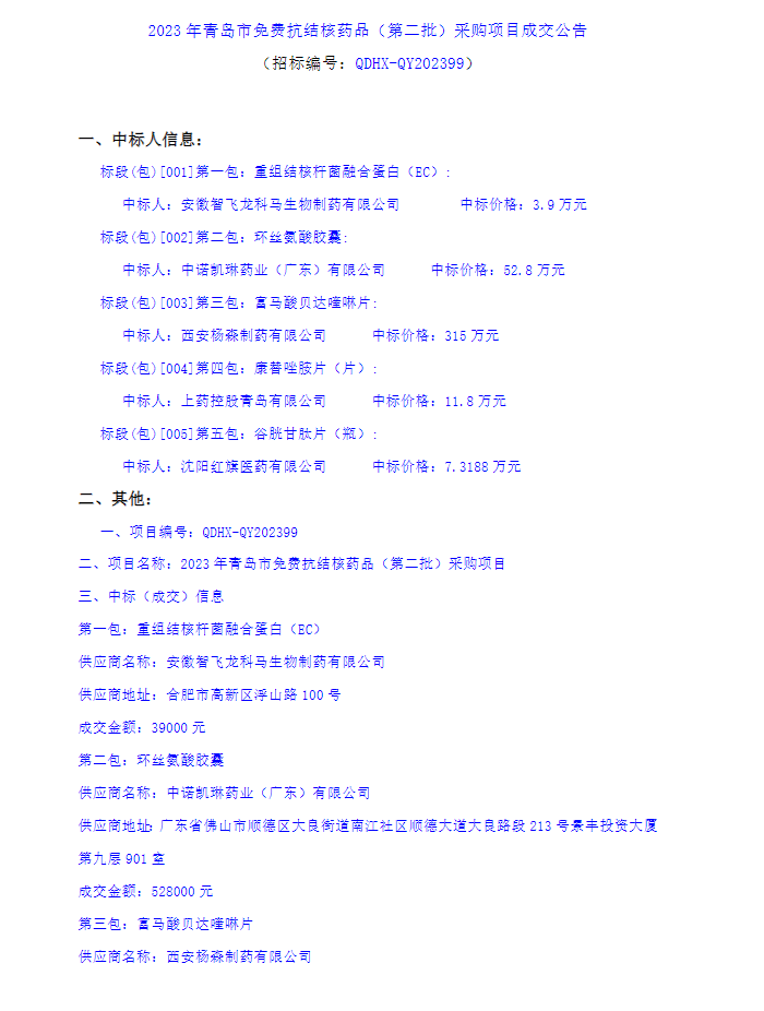 【青岛市胸科医院】山东省青岛市胸科医院2023年青岛市免费抗结核药品(第二批)采购项目成交公告