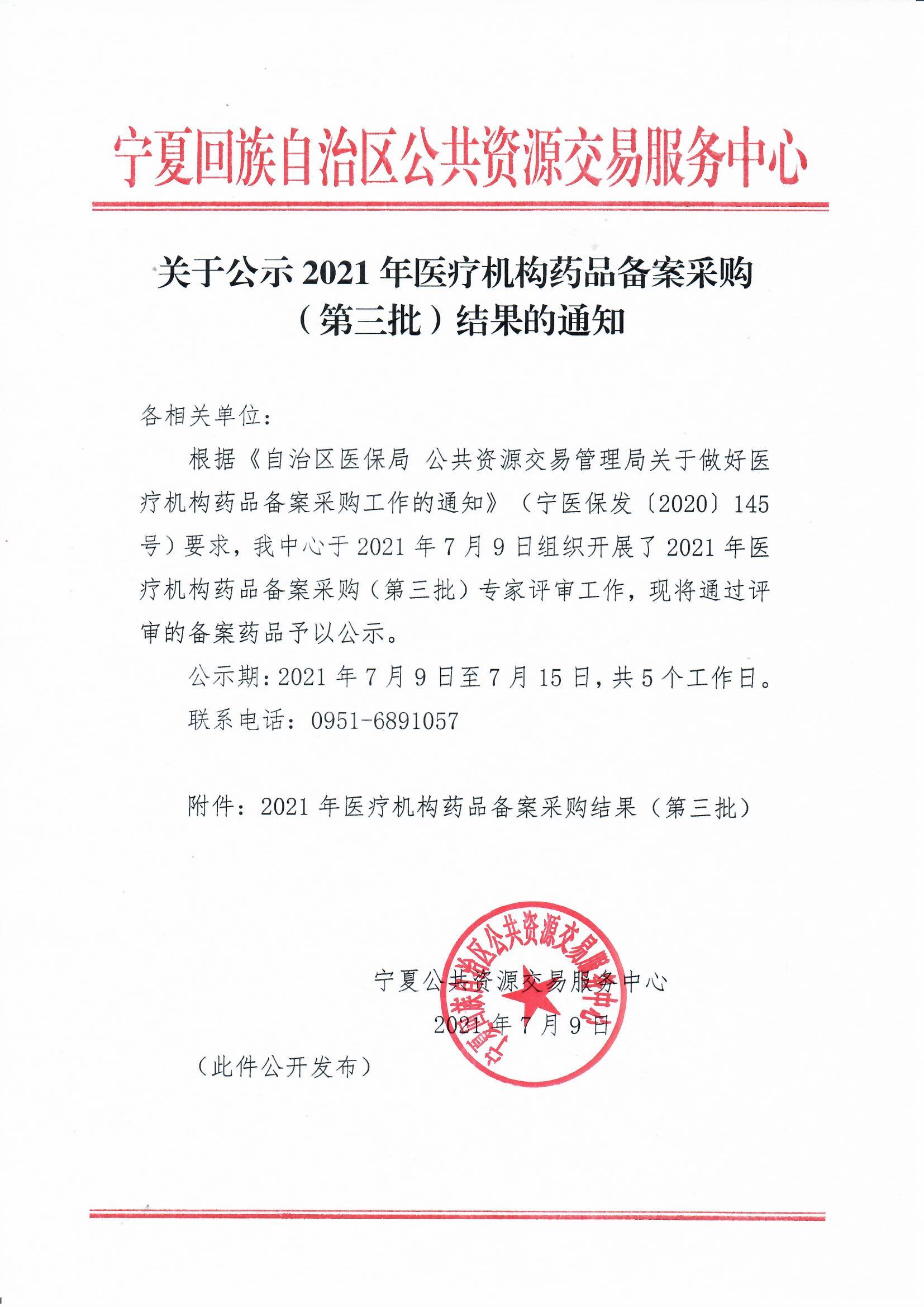 【宁夏】2021年宁夏自治区关于公示2021年医疗机构药品备案采购(第三批)结果的通知