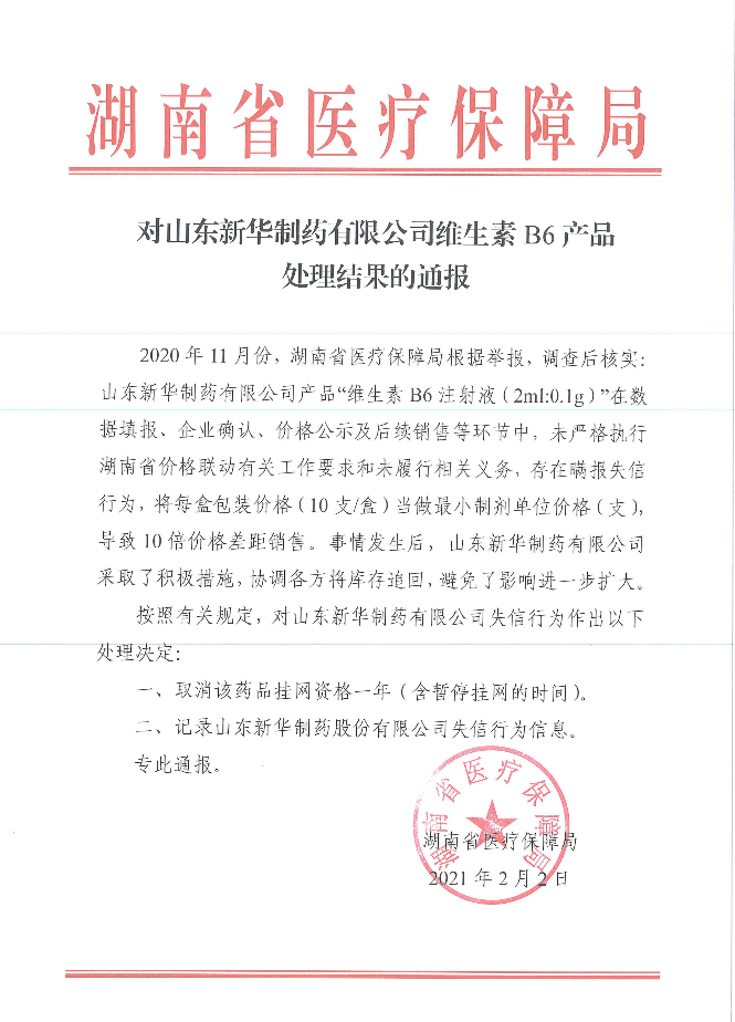 【湖南】2021年湖南省对山东新华制药有限公司维生素B6产品处理结果的通报