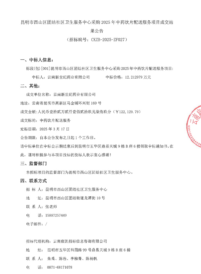 【昆明市西山区团结社区卫生服务中心】云南省昆明市西山区团结社区卫生服务中心采购2025年中药饮片配送服务项目成交结果公告