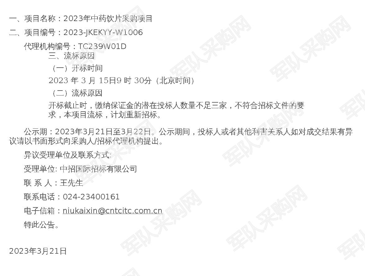 【军队采购】军队采购网2023年中药饮片采购项目流标公告(2023-JKEKYY-W1006)