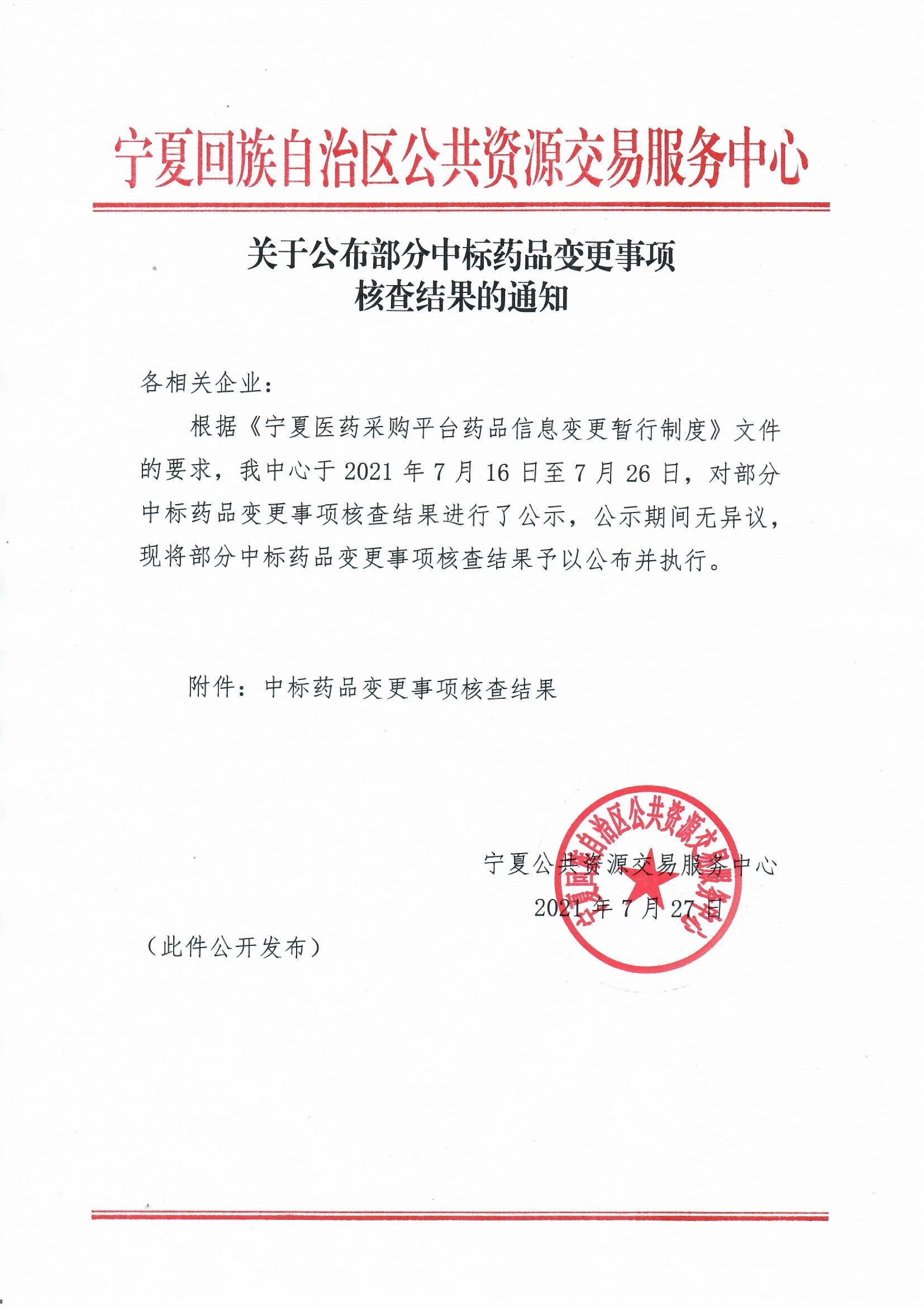 【宁夏】2021年宁夏自治区关于公布部分中标药品变更事项核查结果的通知