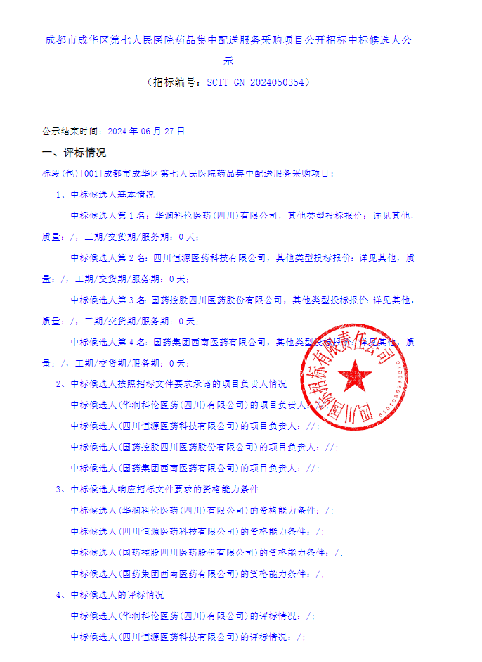 【成都市成华区第七人民医院】四川省成都市成华区第七人民医院药品集中配送服务采购项目公开招标中标候选人公示