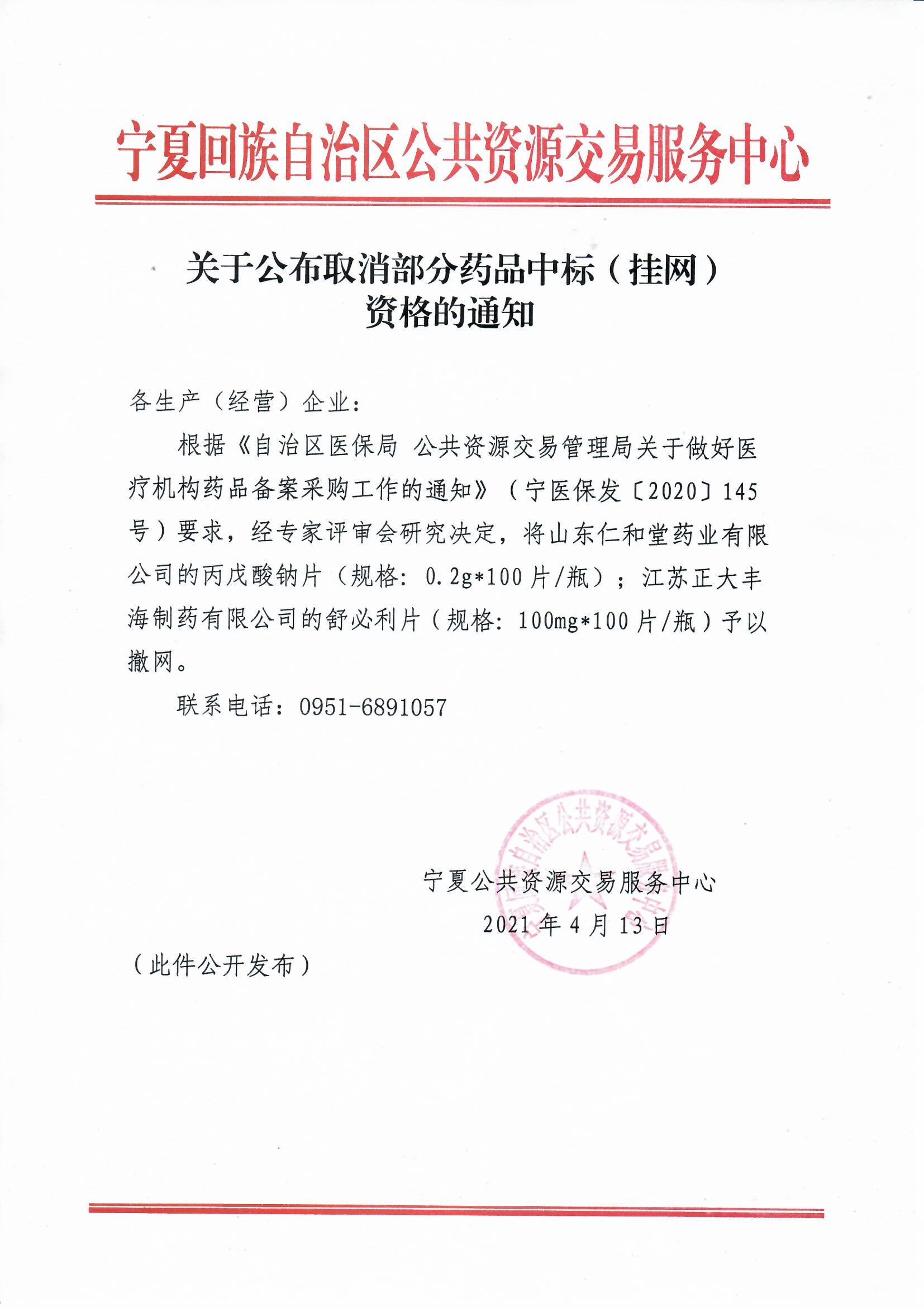 【宁夏】2021年宁夏自治区关于公布取消部分药品中标(挂网)资格的通知