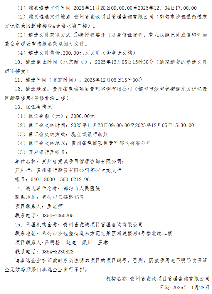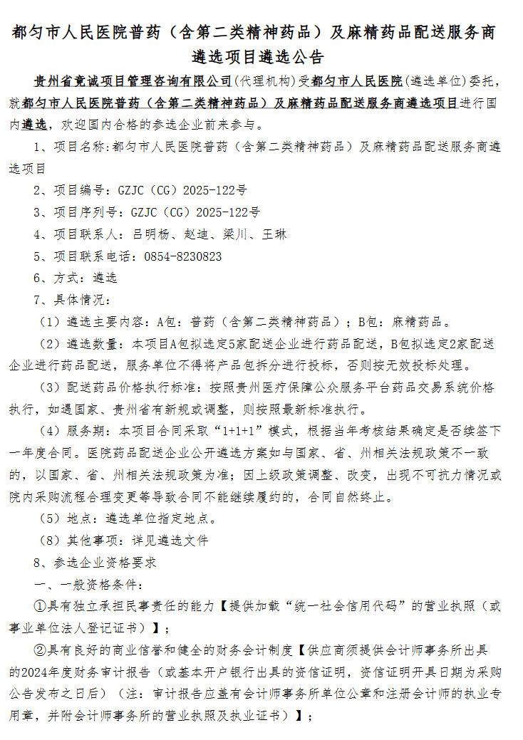 【黔南布依族苗族自治州都匀市人民医院】贵州省都匀市人民医院普药(含第二类精神药品)及麻精药品配送服务商遴选项目遴选公告