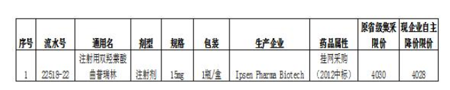 根据企业自主申请,现对益普生(天津)医药贸易有限公司主动申报降价药品“注射用双羟萘酸曲普瑞林(15mg, Ipsen Pharma Biotech,流水号:22518-22)”统一下调省级集采限价(详见下表),请各医疗机构及时下调相关药品价格。