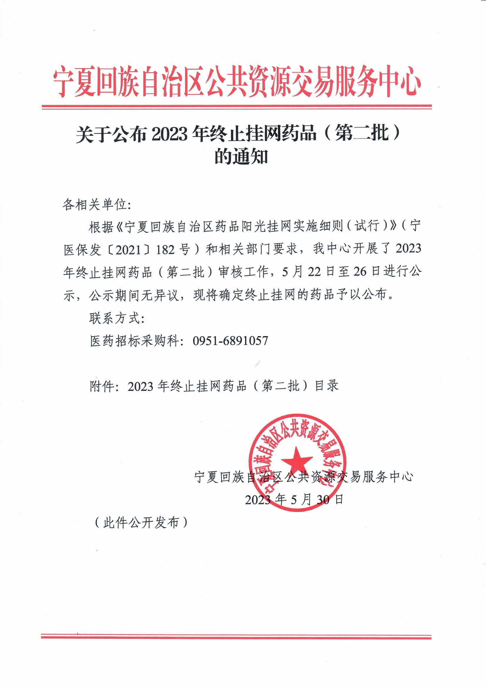 根据《宁夏回族自治区药品阳光挂网实施细则(试行)》(宁医保发〔2021〕182号)和相关部门要求,我中心开展了2023年终止挂网药品(第二批)审核工作,5月22日至26日进行公示,公示期间无异议,现将确定终止挂网的药品予以公布。