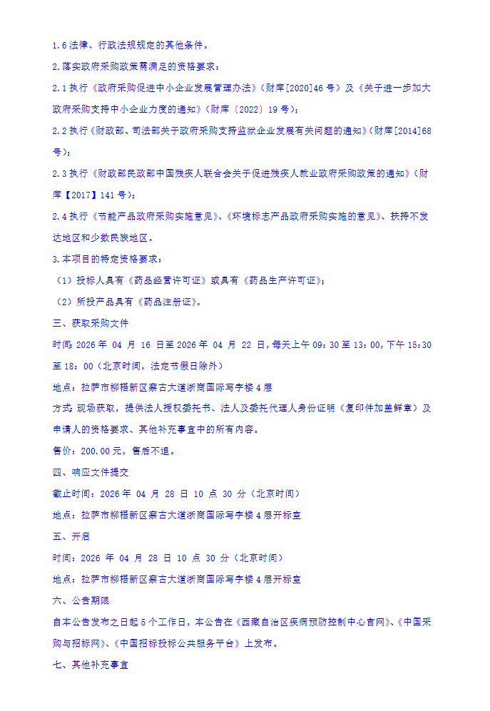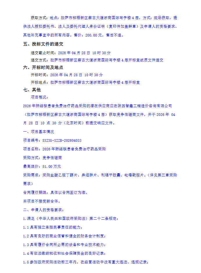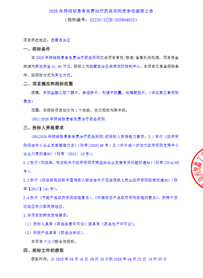 【西藏自治区疾病预防控制中心】西藏自治区疾病预防控制中心2026年肺结核患者免费治疗药品采购竞争性磋商公告