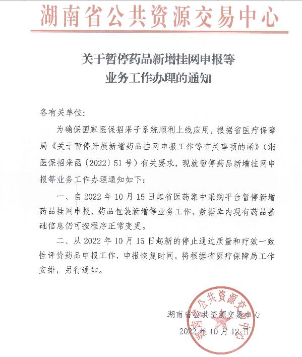 【湖南】关于暂停药品新增挂网申报等业务工作办理的通知