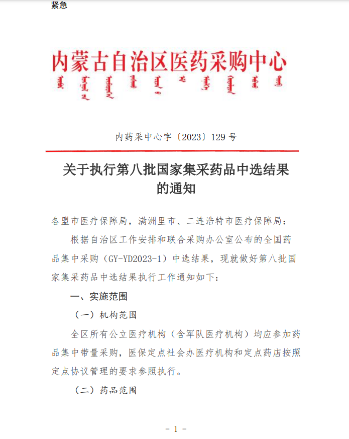 【乌海】关于执行第八批国家集采药品中选结果的通知
