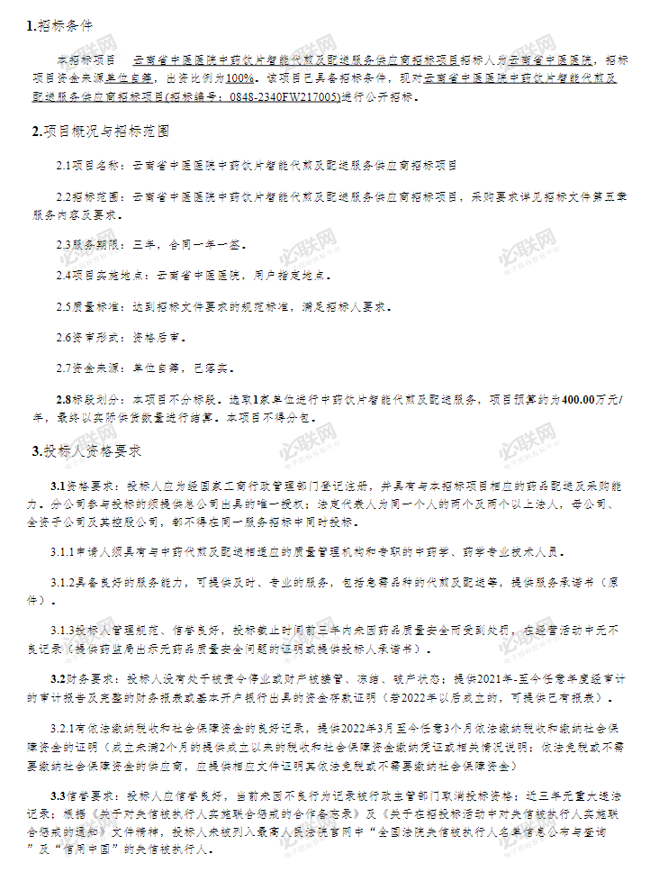 【云南省中医医院】云南省中医医院中药饮片智能代煎及配送服务供应商招标项目招标公告