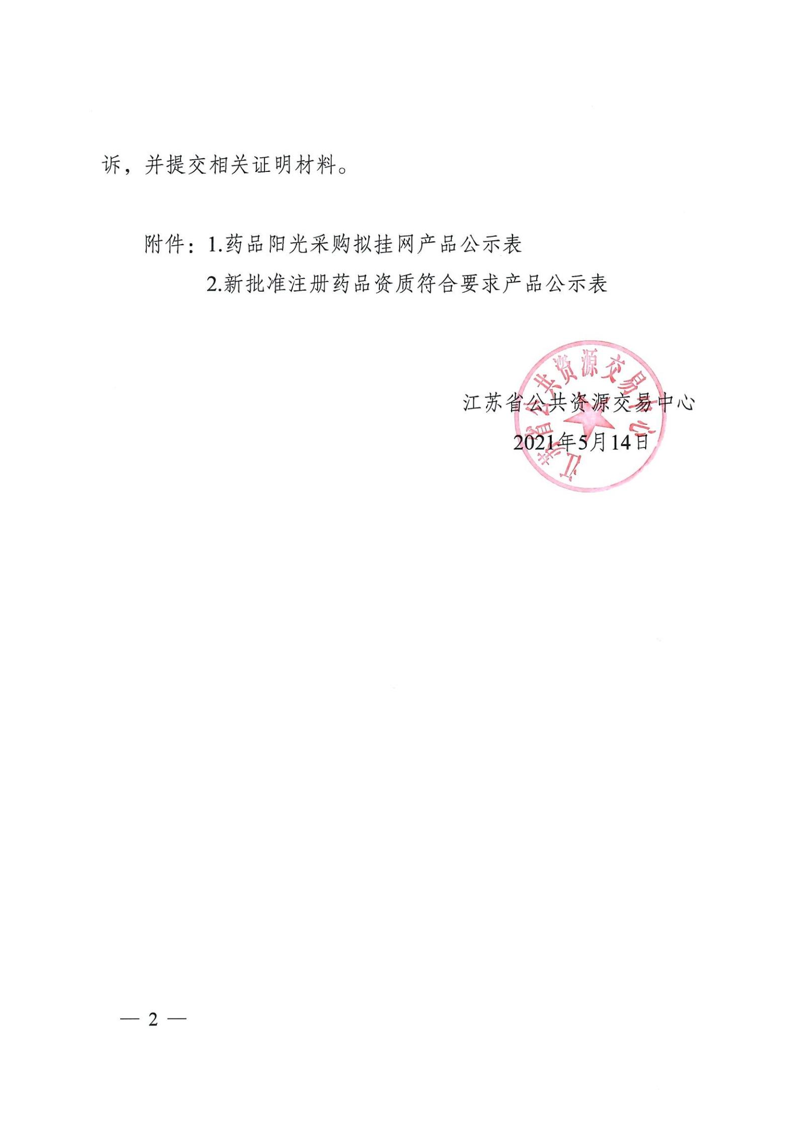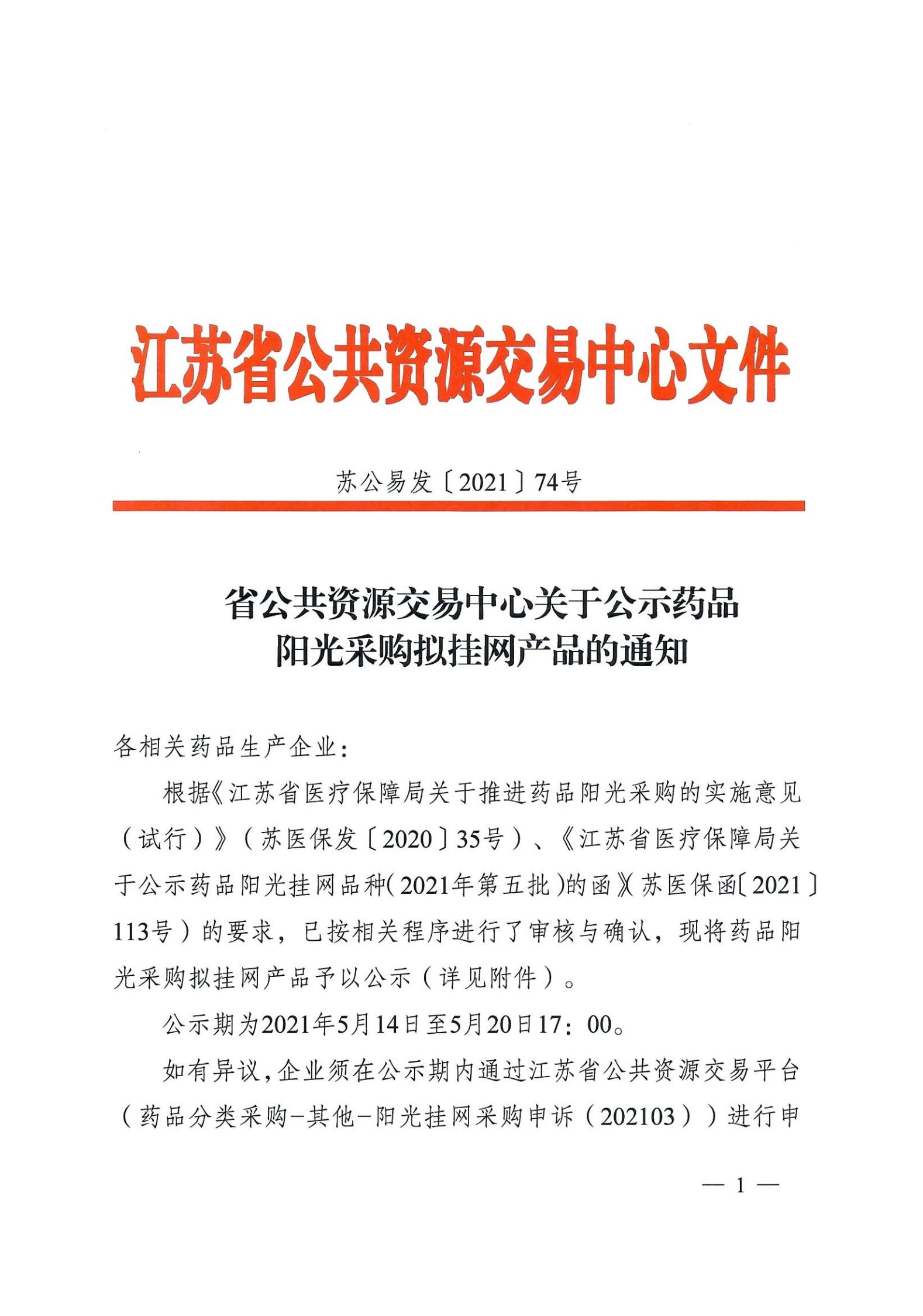 【江苏】2021年江苏省公共资源交易中心关于公示药品阳光采购拟挂网产品的通知 苏公易发[2021]74号