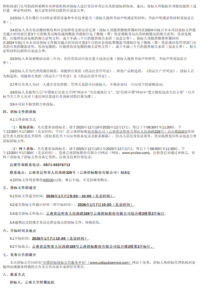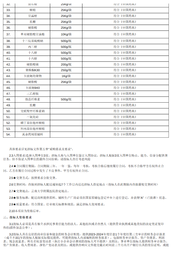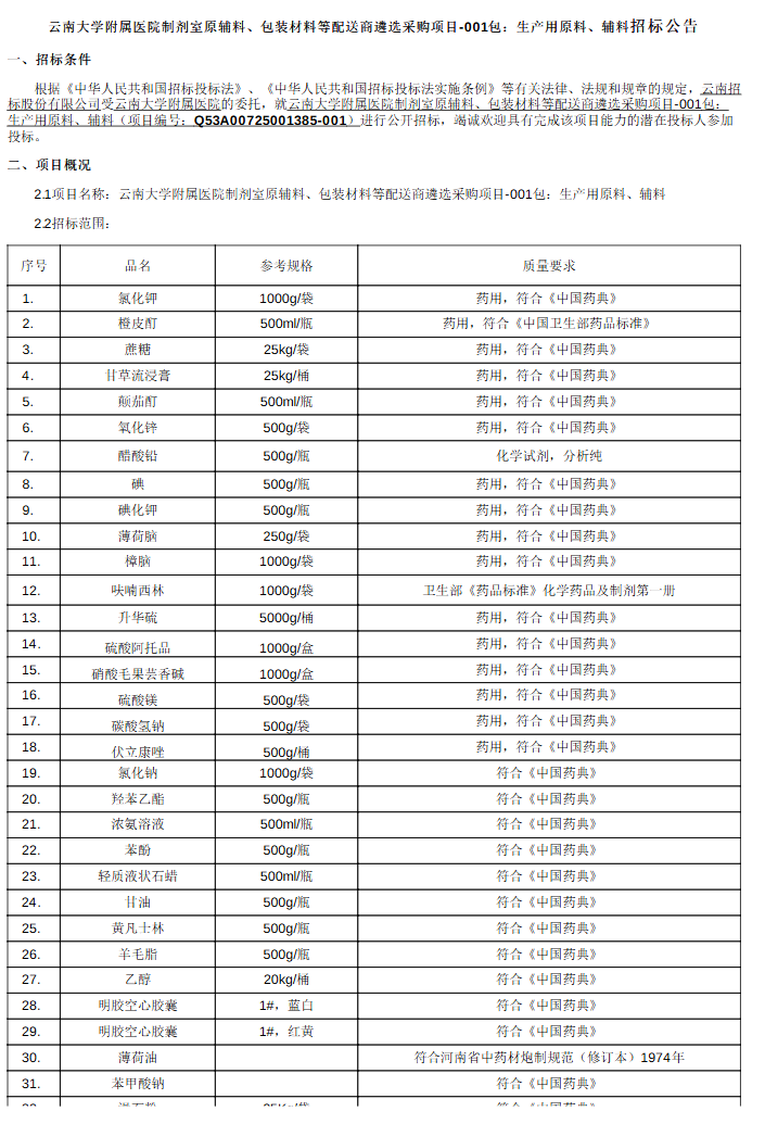 【云南大学附属医院】云南省云南大学附属医院制剂室原辅料、包装材料等配送商遴选采购项目-001包:生产用原料、辅料招标公告