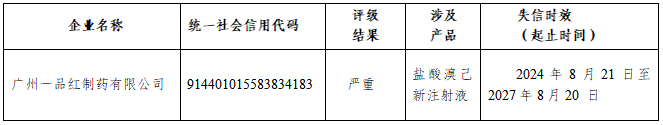 第七批国家组织药品集中带量采购盐酸溴己新注射液中选企业广州一品红制药有限公司,在投标中存在失信情形。根据《国家医疗保障局关于建立医药价格和招采信用评价制度的指导意见》(医保发〔2020〕34号)及《广东省医疗保障局关于建立医药价格和招采信用评价制度的通知》(粤医保发〔2020〕44号)等文件规定,我中心按照国家医疗保障局和省医疗保障局的相关要求,对该企业开展医药价格和招采信用评价,信用评级结果如下:
