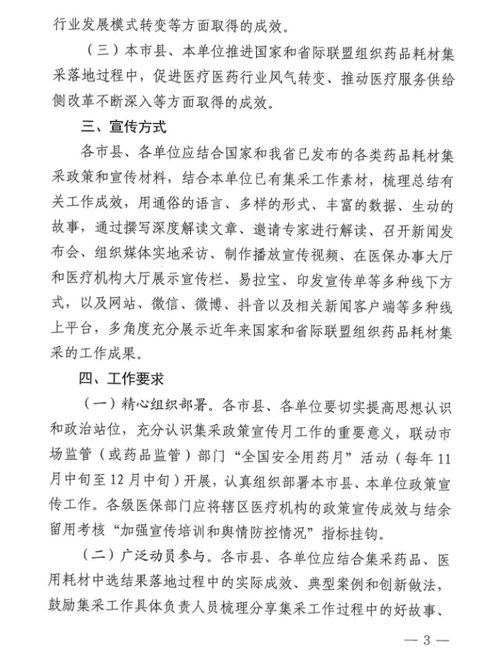 各市县、各单位应结合国家和我省已发布的各类药品耗材集采政策和宣传材料,结合本单位已有集采工作素材,梳理总结有关工作成效,用通俗的语言、多样的形式、丰富的数据、生动的故事,通过撰写深度解读文章、邀请专家进行解读、召开新闻发布会、组织媒体实地采访、制作播放宣传视频、在医保办事大厅和医疗机构大厅展示宣传栏、易拉宝、印发宣传单等多种线下方式,以及网站、微信、微博、抖音以及相关新闻客户端等多种线上平台,多角度充分展示近年来国家和省际联盟组织药品耗材集采的工作成果。