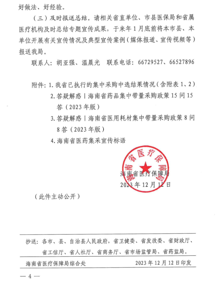 药品、医用耗材集中带量采购(以下简称“药品耗材集采”)是党中央和国务院高度重视和重点推进的医改工作之一,也是“三医联动”改革的重要一环。2019年12月20日,经省政府同意,我局牵头联合省卫健委、省药监局等九厅局,推动第一批集中带量采购中选的25个药品正式在海南开始销售。4年来,我省相继落地各批次集采中选结果,出台集采药品耗材挂网、非中选药品支付标准调整、采购量监测通报、替代用药监测、供应配送管理、质量监管、结余留用考核奖励等多个配套政策文件,高效、有序、稳妥地保障了药品耗材中选结果在海南落地。截至今年12月1日,我省已执行国家组织的八个批次药品集中采购和三个批次医用耗材集中采购,参加九个药品集采省际联盟和十三个医用耗材集采省际联盟,落地集采药品数超过840个,医用耗材数达16种,我省跟标集采联盟数、执行集采药品耗材数量在全国排名前列,平均降价幅度超过50%,累计节约采购费用超35亿元。