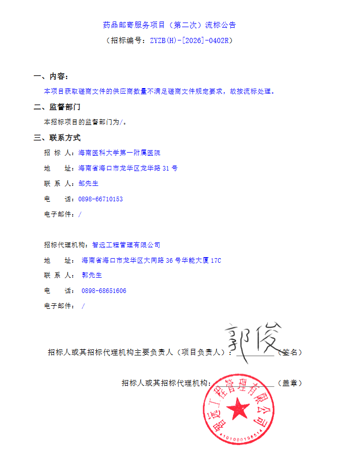 【海南医科大学第一附属医院】海南医科大学第一附属医院药品邮寄服务项目(第二次)流标公告