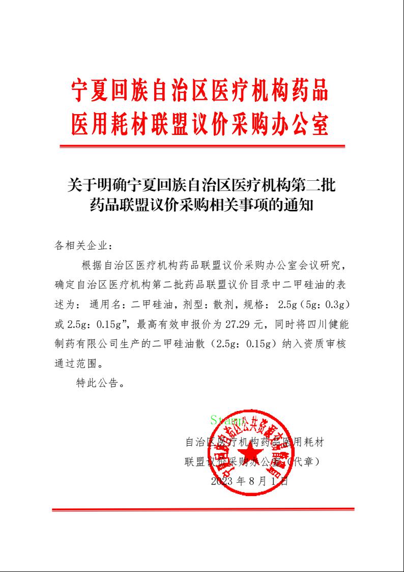 根据自治区医疗机构药品联盟议价采购办公室会议研究,确定自治区医疗机构第二批药品联盟议价目录中二甲硅油的表述为:通用名:二甲硅油,剂型:散剂,规格:2.5g(5g:0.3g)或2.5g:0.15g",最高有效申报价为27.29元,同时将四川健能制药有限公司生产的二甲硅油散(2.5g:0.15g)纳入资质审核通过范围。