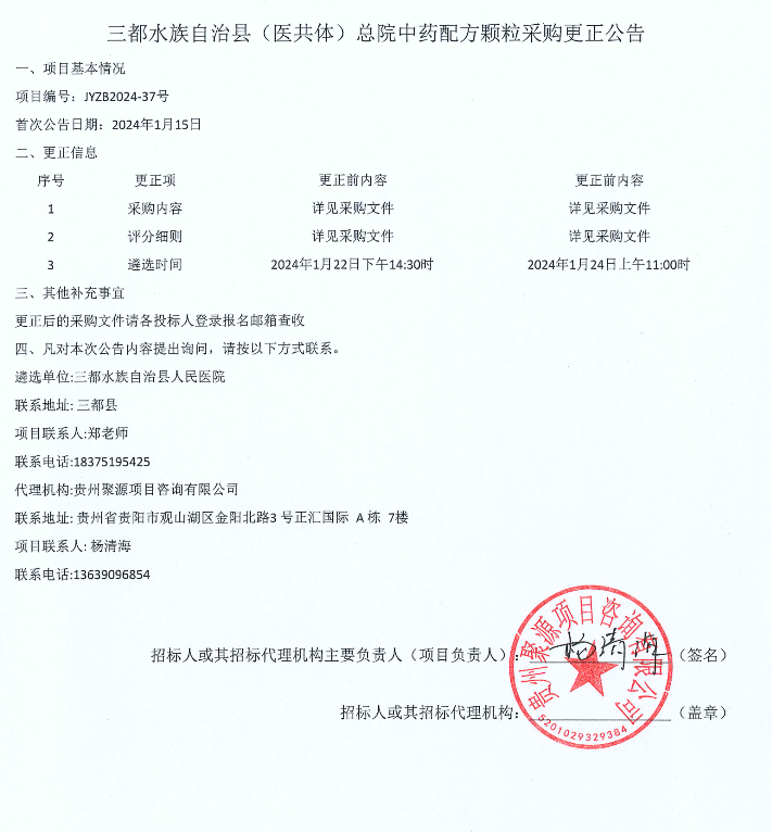 【黔南布依族苗族自治州三都水族自治县人民医院】贵州省黔南布依族苗族自治州三都水族自治县(医共体)总院中药配方颗粒采购更正公告