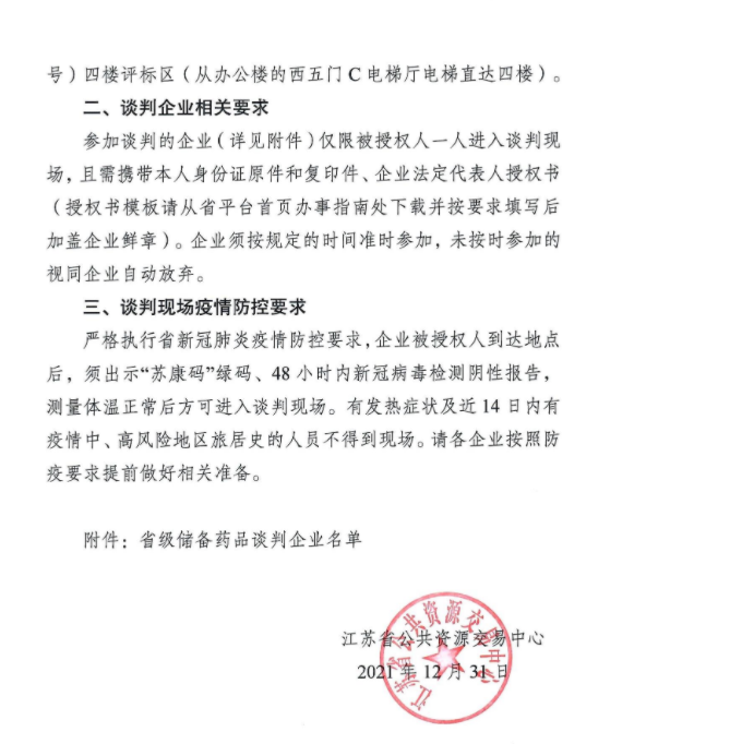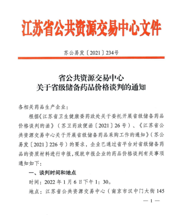 【江苏】江苏省公共资源交易中心关于省级储备药品价格谈判的通知