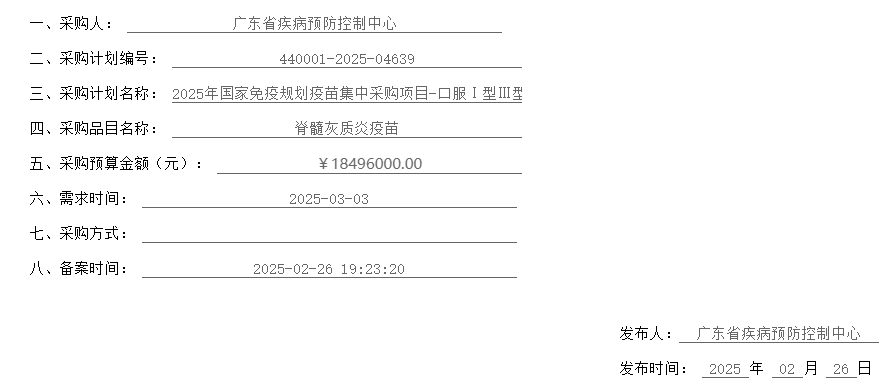【广东省疾病预防控制中心】广东省2025年国家免疫规划疫苗集中采购项目-口服Ⅰ型Ⅲ型脊髓灰质炎减毒活疫苗