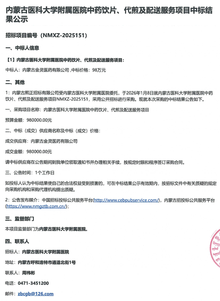 【内蒙古医科大学附属医院】内蒙古医科大学附属医院中药饮片、代煎及配送服务项目中标结果公示