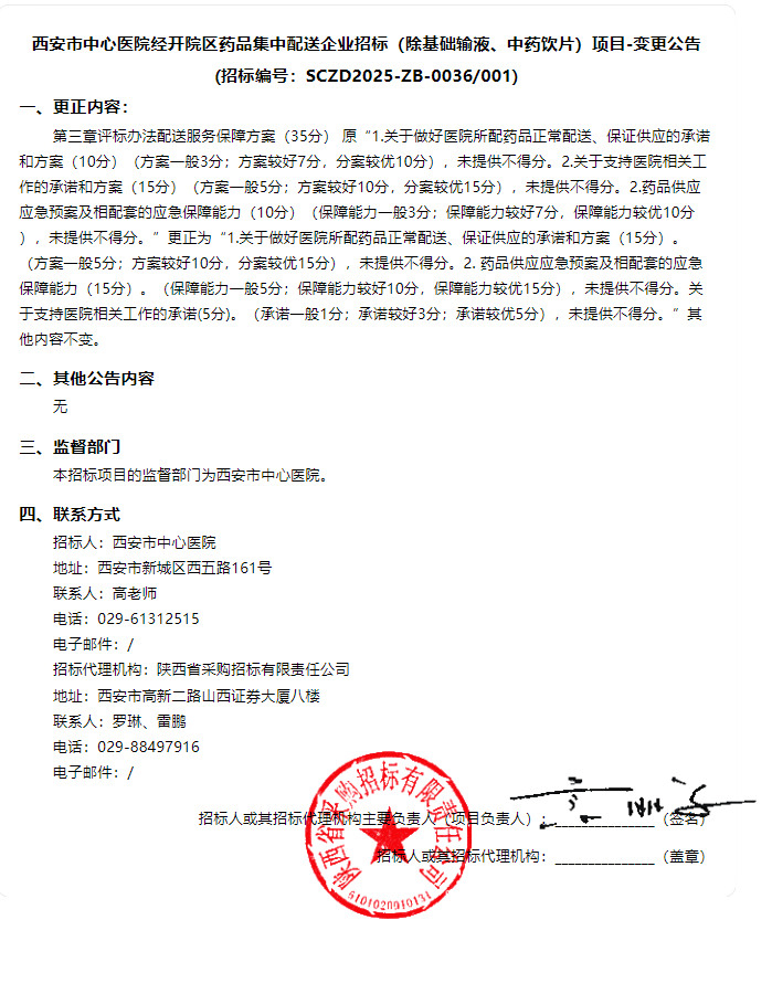 【西安市中心医院】陕西省西安市中心医院经开院区药品集中配送企业招标(除基础输液、中药饮片)项目-变更公告