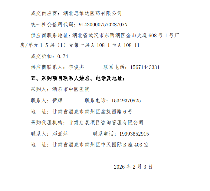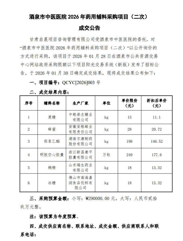 【酒泉市中医医院】甘肃省酒泉市中医医院2026年药用辅料采购项目(二次)成交公告