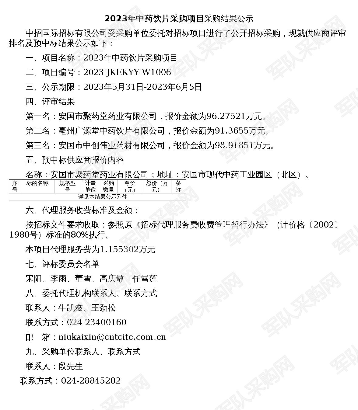 【军队采购】军队采购网2023年中药饮片采购项目中标公示(2023-JKEKYY-W1006)