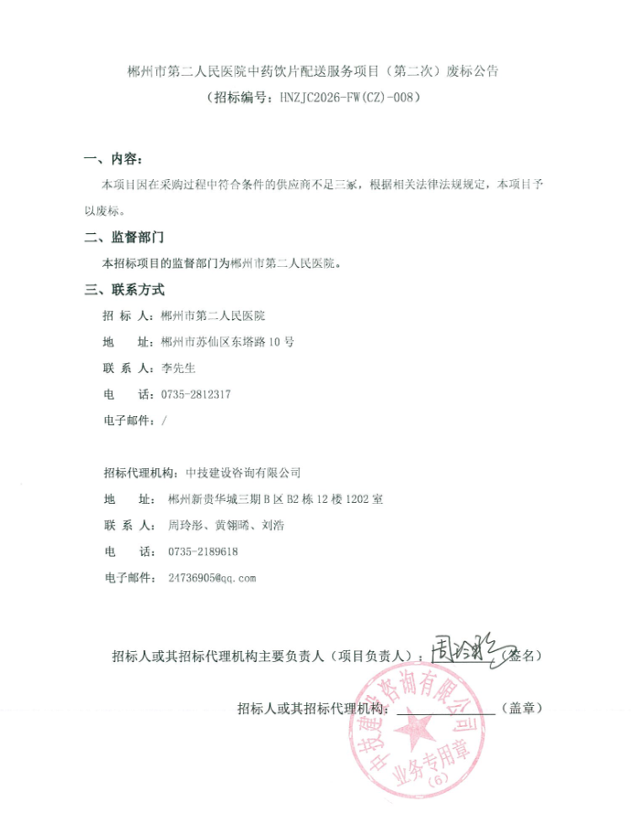 【郴州市第二人民医院】湖南省郴州市第二人民医院中药饮片配送服务项目(第二次)废标公告