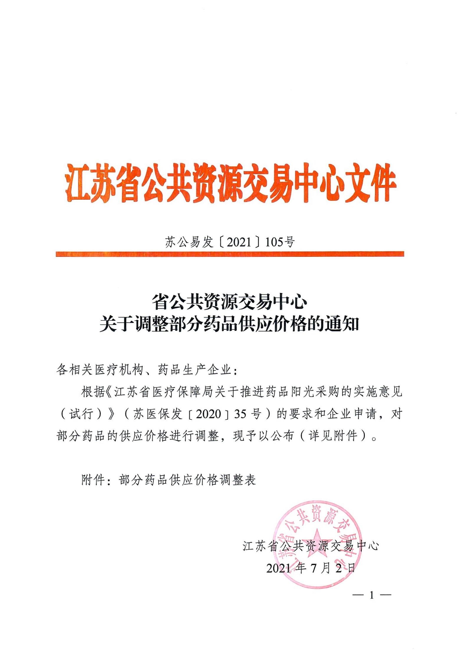 【江苏】2021年江苏省公共资源交易中心关于调整部分药品供应价格的通知 苏公易发[2021]105号