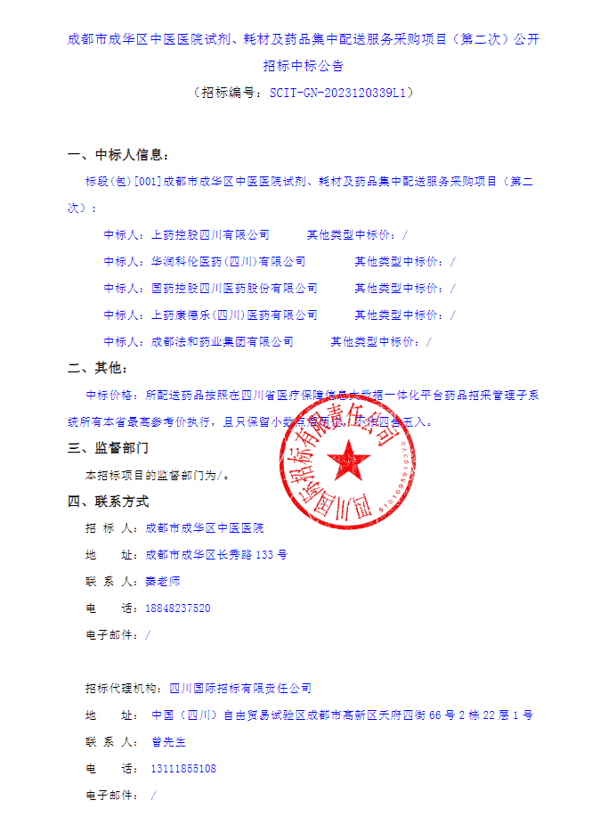 【成都市成华区中医医院】四川省成都市成华区中医医院试剂、耗材及药品集中配送服务采购项目(第二次)公开招标中标公告