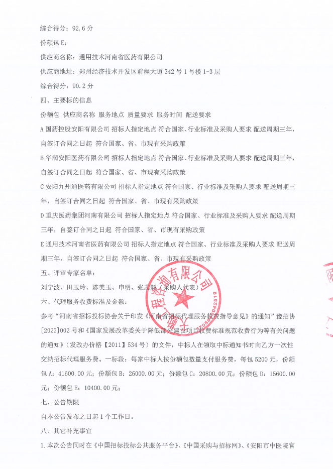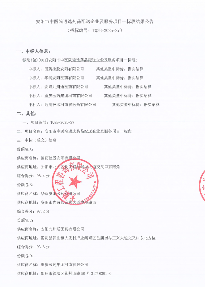 【安阳市中医院】河南省安阳市中医院遴选药品配送企业及服务项目一标段结果公告
