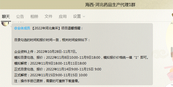 目录勾选的时间和报价时间一致,相关时间安排如下: 企业资料上传:2022年10月28日-11月7日。 模拟目录勾选、报价:2022年11月8日10:00-11月9日18:00,模拟报价价格统一填“1”即可。 模拟解密:2022年11月9日18:00-11月11日18:00 正式目录勾选、报价:2022年11月14日9:00-11月15日 9:00 正式解密:2022年11月15日9:00-11月15日 10:00 注:操作手册已更新,需要的可重新下载查看。