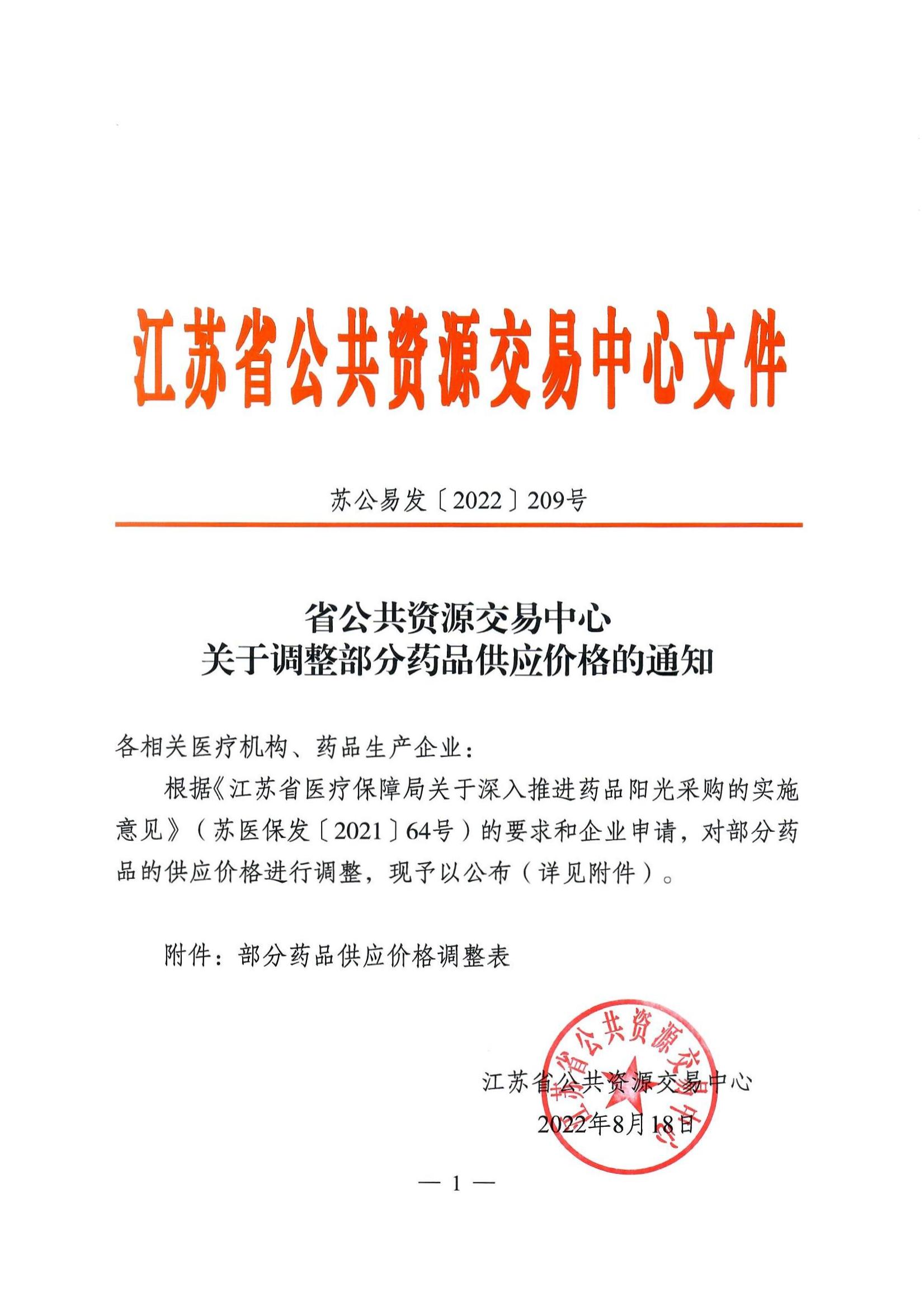 【江苏】省公共资源交易中心关于调整部分药品供应价格的通知