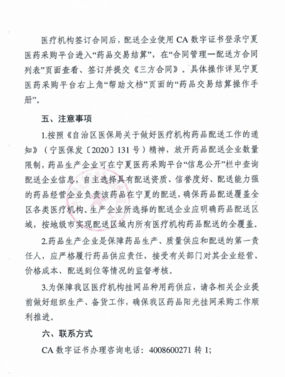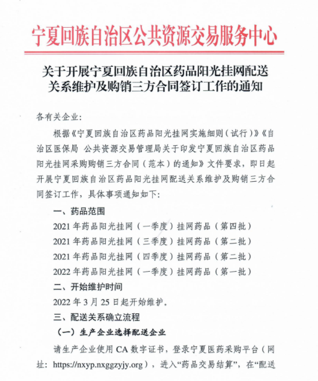 【宁夏】关于开展宁夏回族自治区药品阳光挂网配送关系维护及购销三方合同签订工作的通知