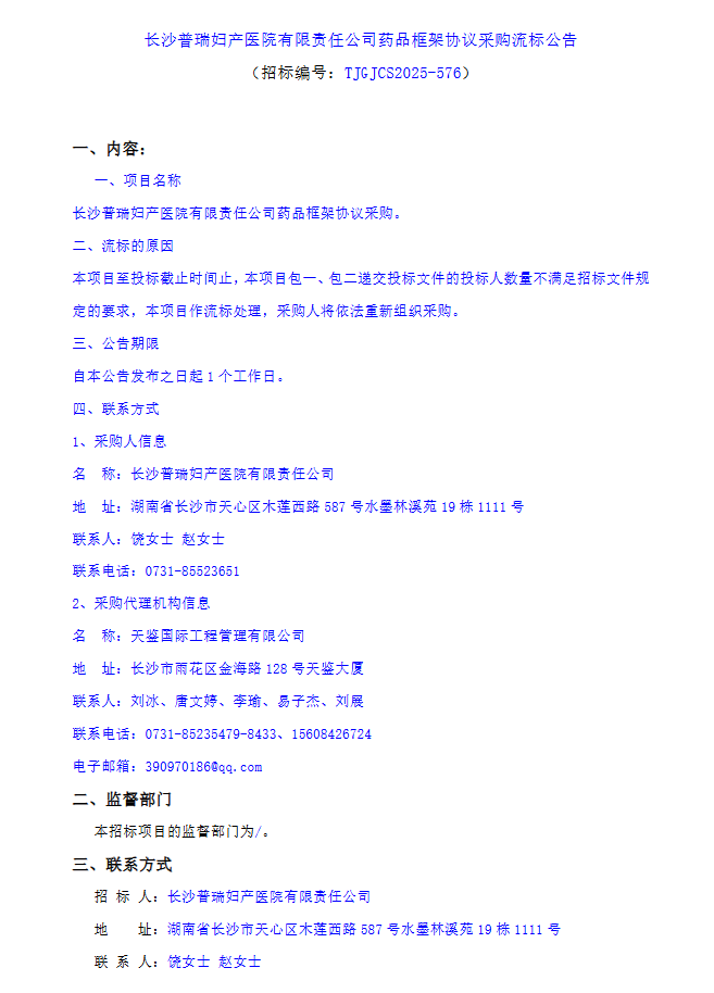 【长沙市普瑞妇产医院】湖南省长沙普瑞妇产医院有限责任公司药品框架协议采购流标公告