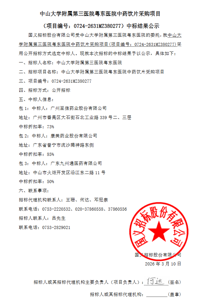 【中山大学附属第三医院粤东医院】广东省中山大学附属第三医院粤东医院中药饮片采购项目 (项目编号:0724-2631MZ380277)中标结果公示