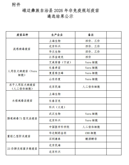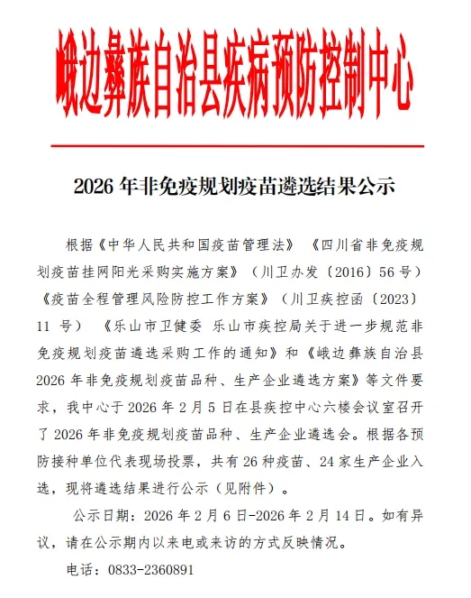【乐山】峨边疾控2026年非免疫规划疫苗遴选结果公示