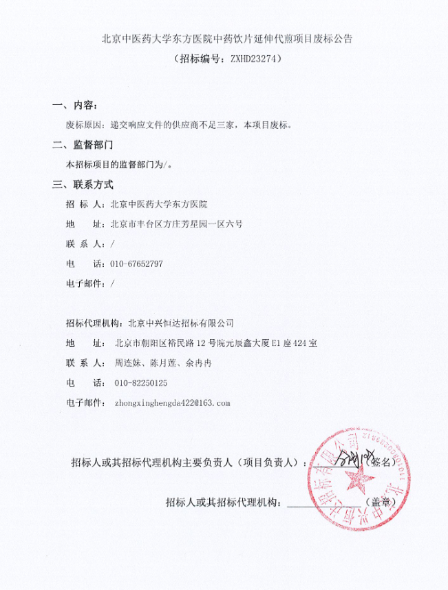 【北京中医药大学东方医院】北京中医药大学东方医院中药饮片延伸代煎项目废标公告