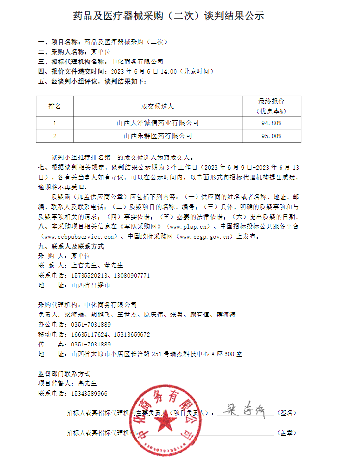 【吕梁市某单位】山西省吕梁市药品及医疗器械采购(二次)谈判结果公示