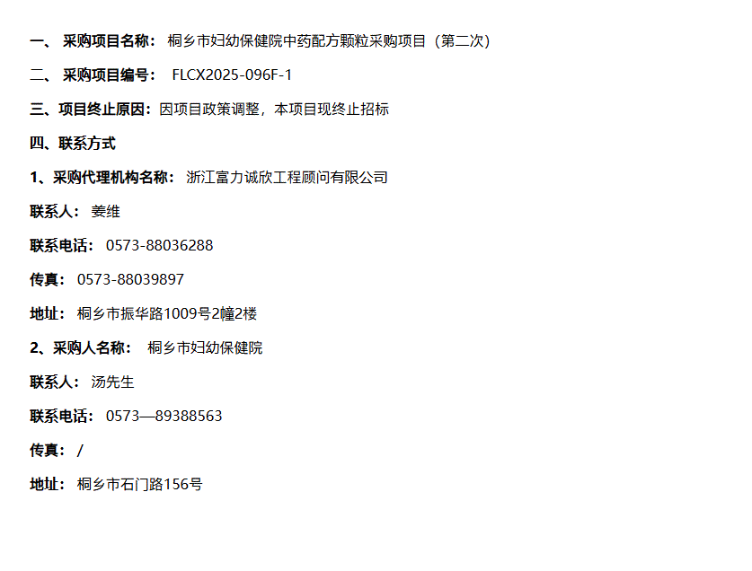 【嘉兴市桐乡市妇幼保健院】浙江省桐乡市妇幼保健院中药配方颗粒采购项目(第二次) 终止公告