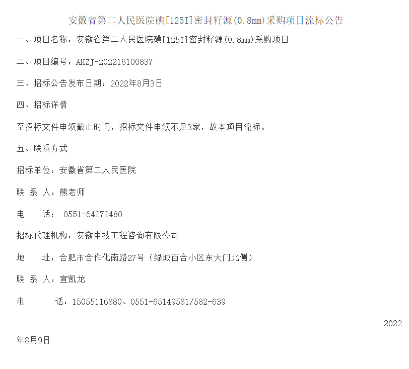 【安徽省第二人民医院】安徽省第二人民医院碘〔125I〕密封籽源(0.8mm)采购项目流标公告